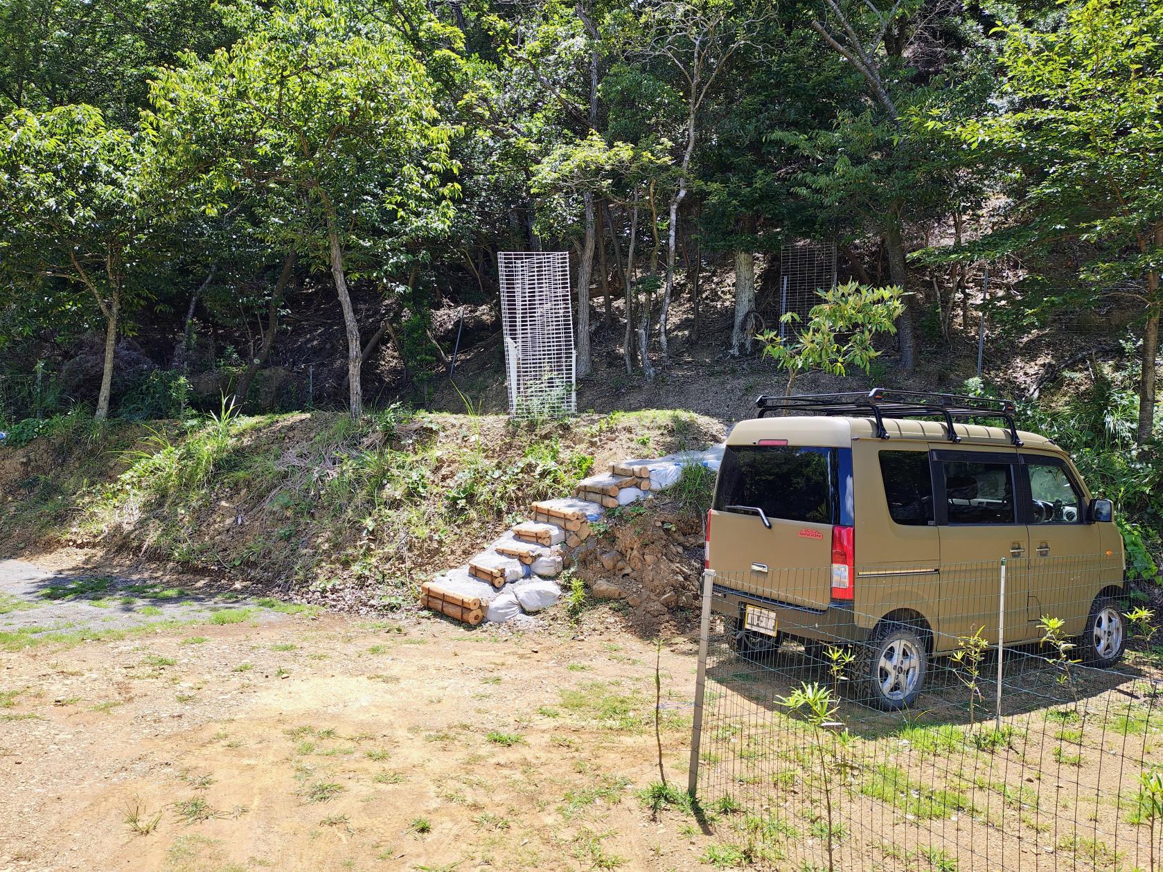 フリーサイト10番には車を乗り入れることができます。9番は一段高さがあるので車の乗り入れはできませんが、サイトのすぐ近く(階段下)に停めることができます。