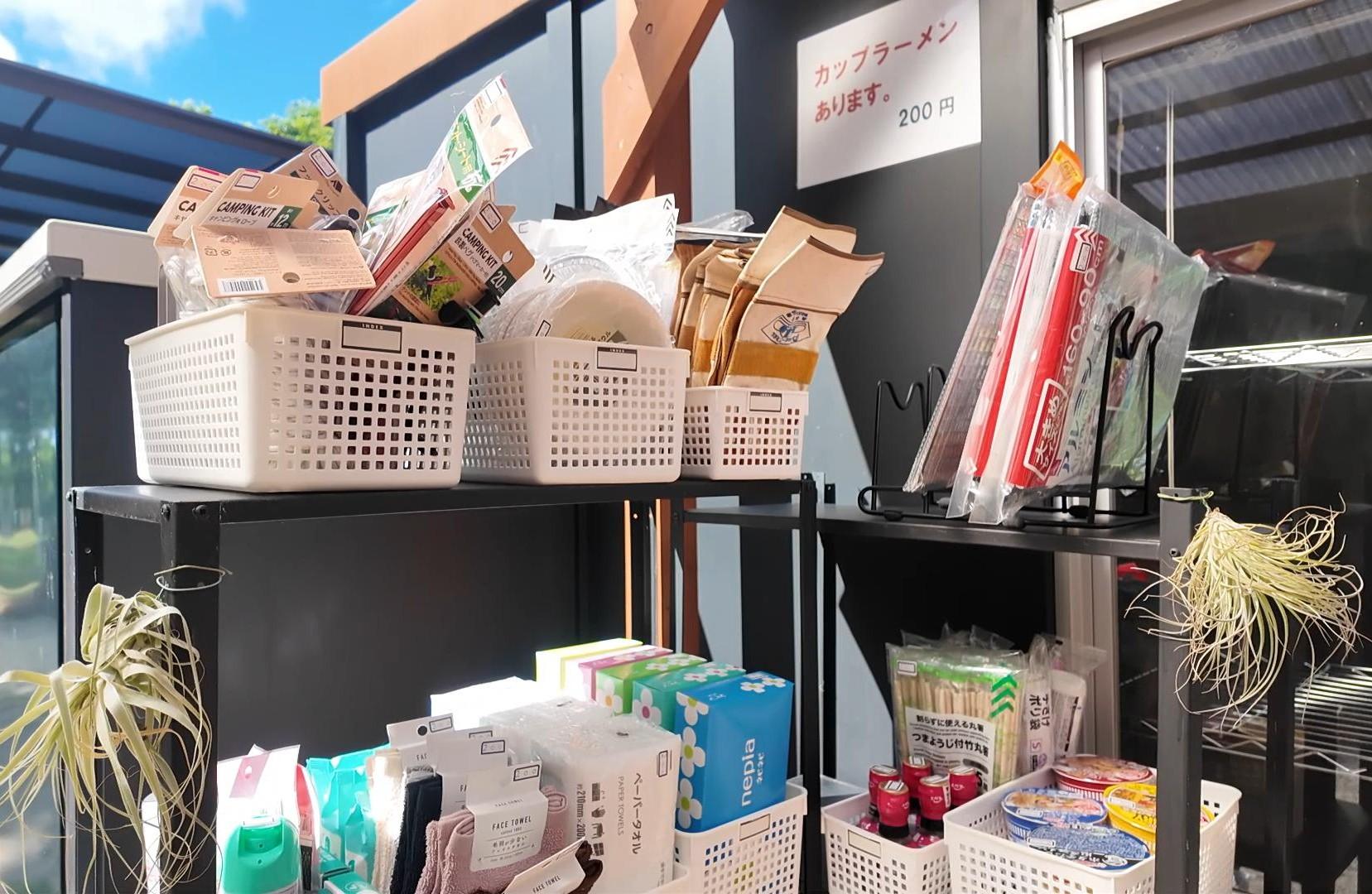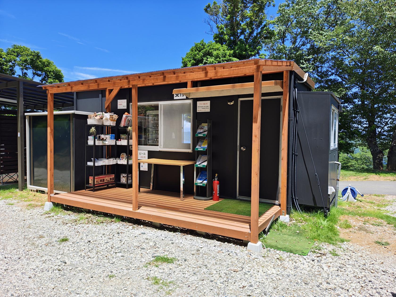 まずは受付を行う管理棟。消耗品やカップラーメンなどの食品、冷えたビールやお水などの販売のほか、テントやBBQ台、チェア、テーブルなどのレンタルも行っていますので、忘れ物をした時などはお気軽にご相談ください。