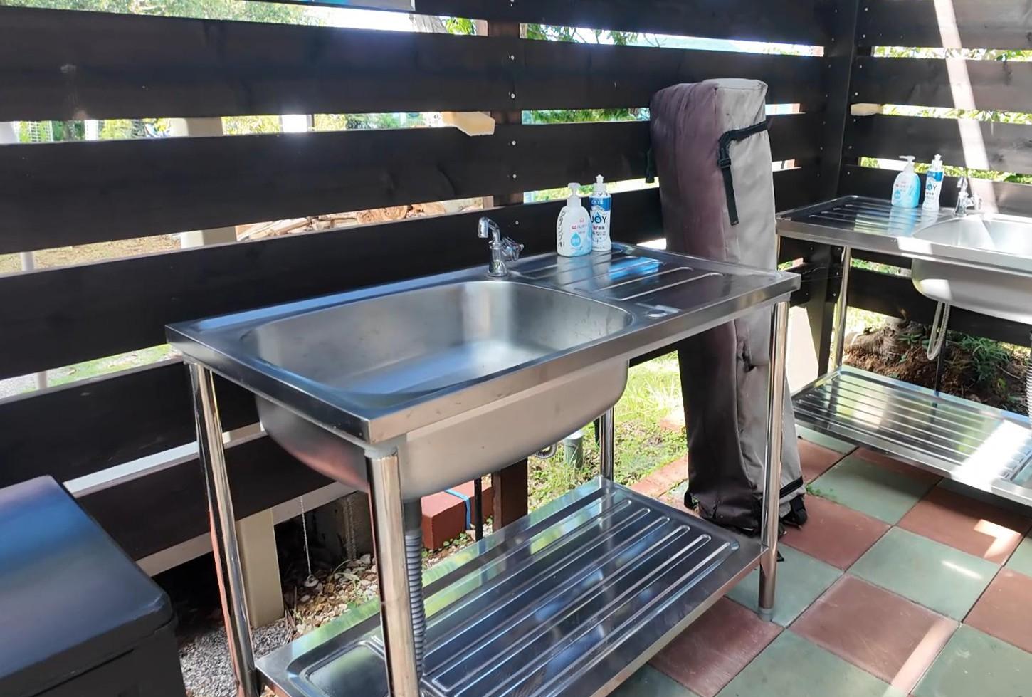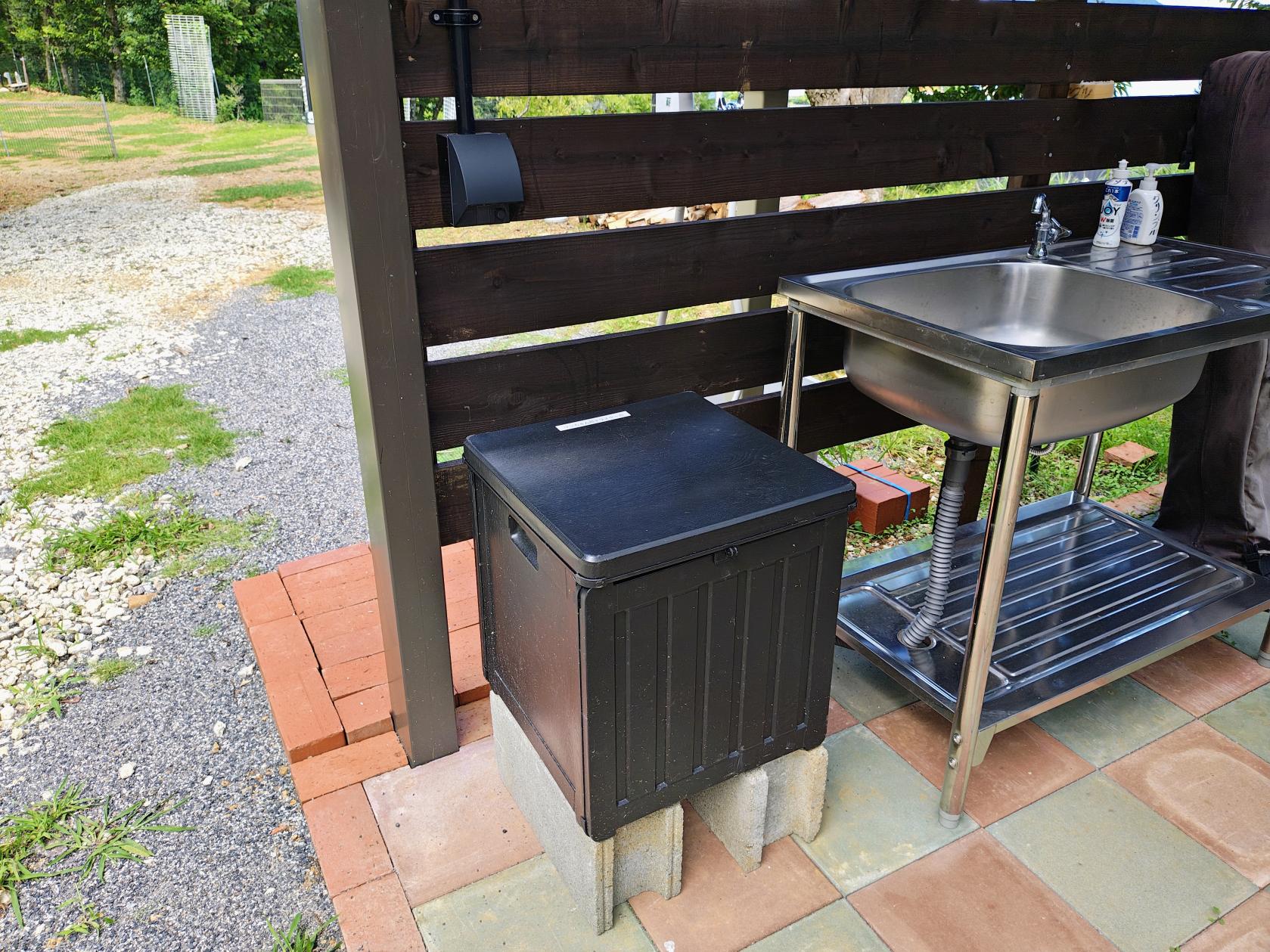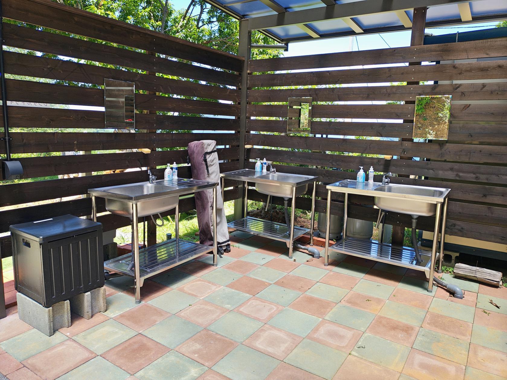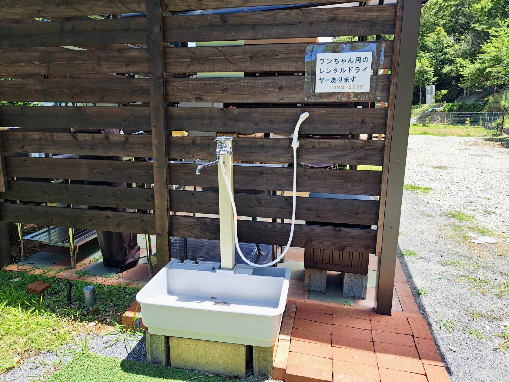 管理棟の横には炊事場があります。洗い場(湯は出ません)は3つ、上水道ですので飲料水としても利用可能です。また炊事場の外側には、ワンちゃんの足を洗ったりできる低めの洗い場(シャワーもついてます)があります。ドライヤーのレンタル(10分/200円)もあり、小型犬の場合はドライヤー台も用意されています。愛犬家には嬉しいポイントですね!