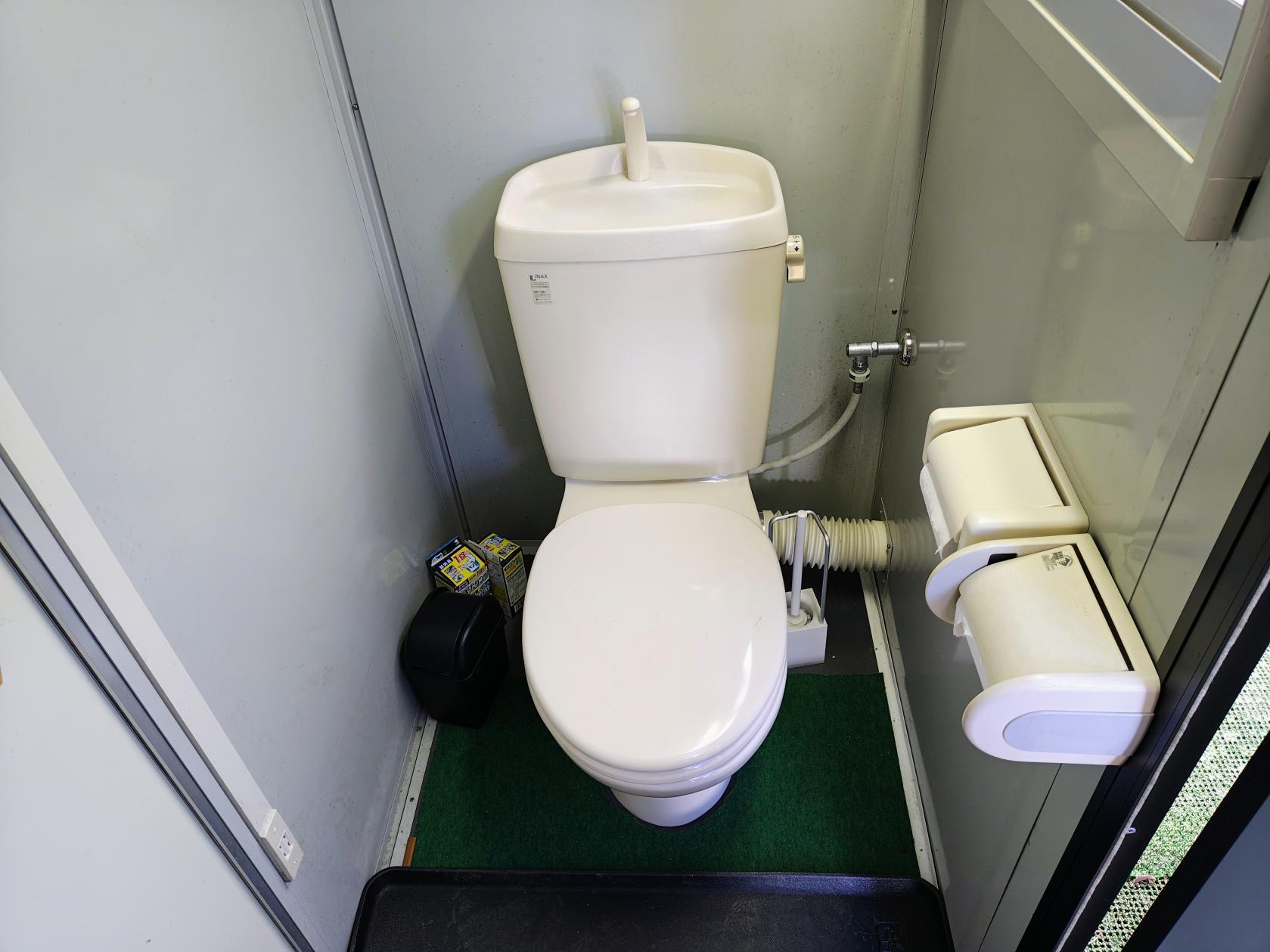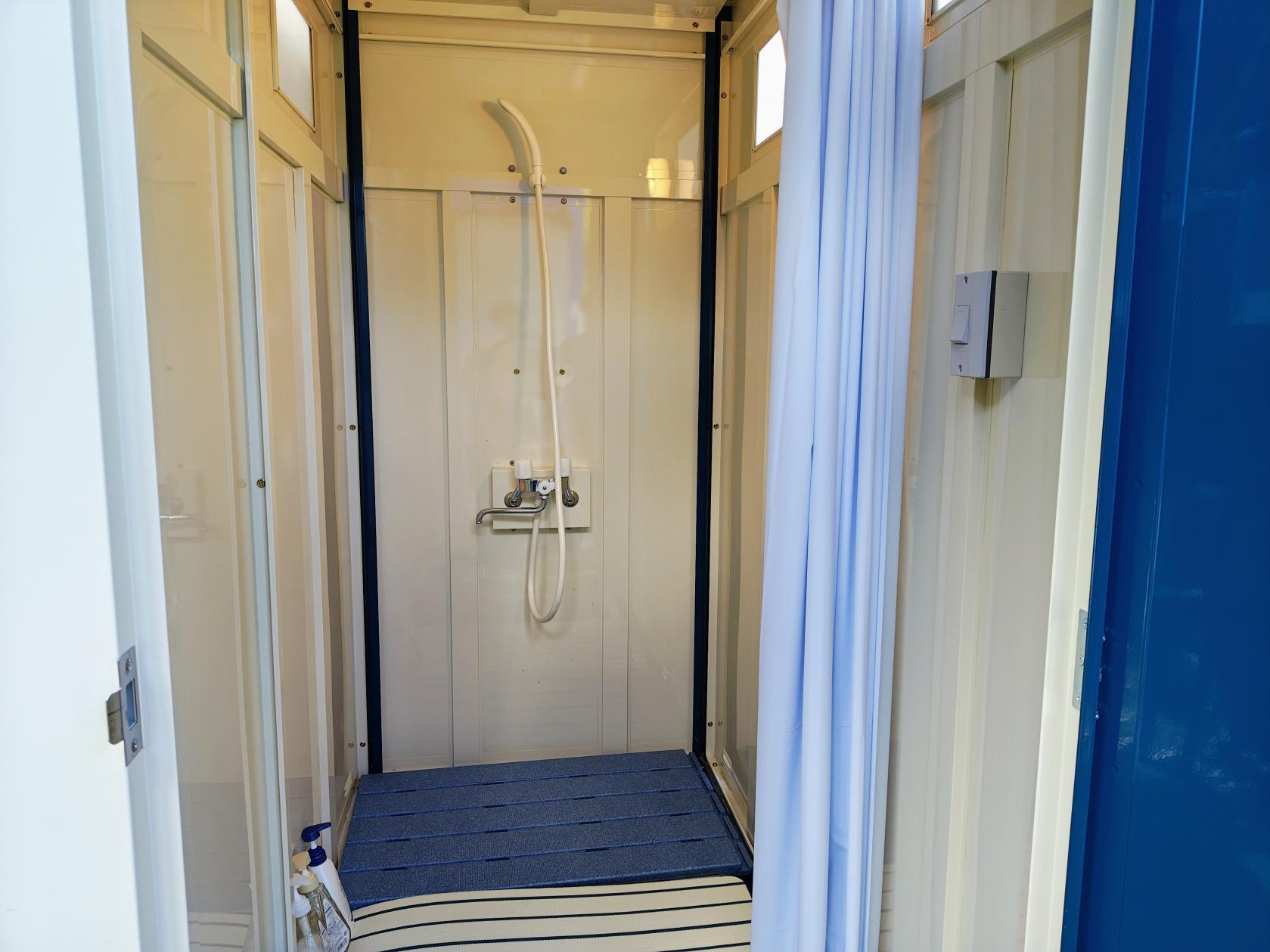 管理棟と炊事場の間の通路の奥には、水洗の洋式トイレが2つ、シャワーが1室あります。シャワー(5分/100円)を利用する場合は、受付でお申し込みください。