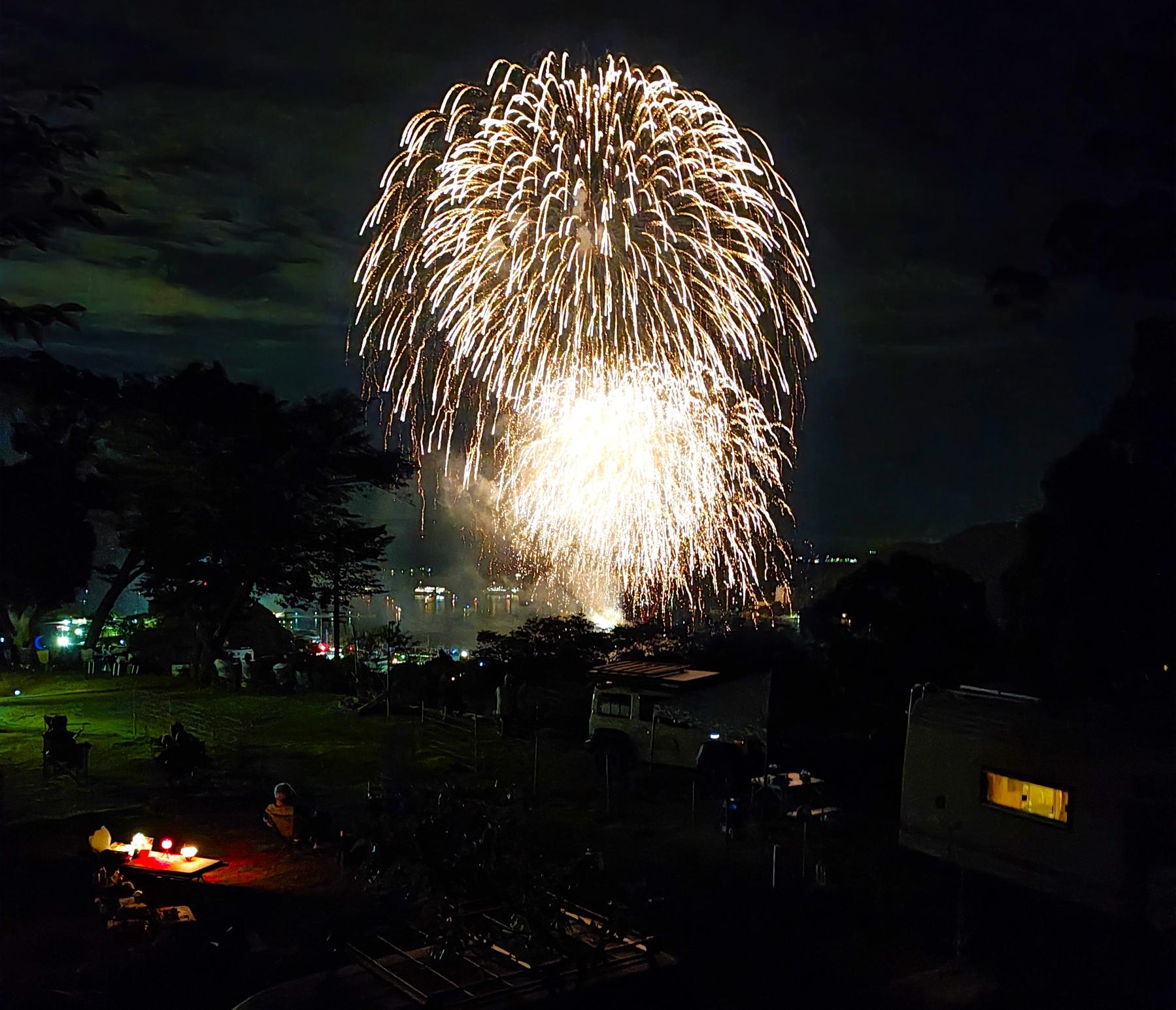 「GRENBLU」はまつり会場からも近く高台にあるので、絶景サイトやフリーサイト、共有スペースから、鳥羽湾を豪快に染め上げる海上花火を見ることができるんです!キャンプしながら花火が見れるって贅沢ですよね~!夜空に打ち上る花火も海上花火も綺麗にみえて大満足でした!